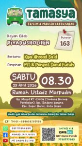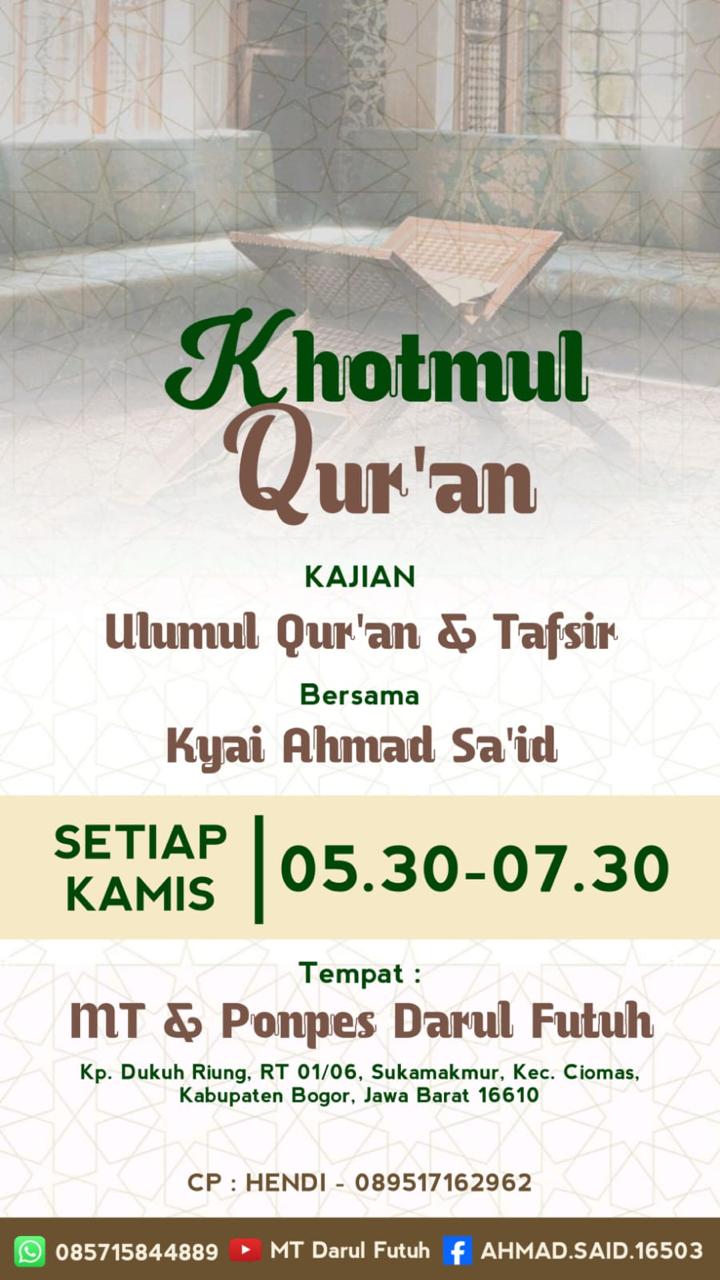 Dalam rangka mengembangkan syiar Islam di lingkungan Majelis Ta’lim & Pondok Pesantren Darul Futuh, Kp. Dukuh Riung RT 01 & 02 RW 06 Desa Sukamakmur, Ciomas, alhamdulillah setiap hari Kamis pagi kami Insya Allah Akan Rutin menyelenggarakan kegiatan Santunan Anak Yatim dan Sarapan Berkah Kamis Pagi bersama Warga, yang diawali dengan pembacaan doa Khatmil Qur’an serta Doa Birrul Walidain.