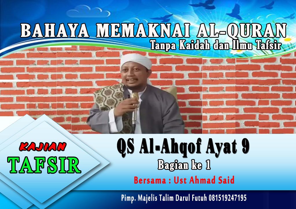 Assalamu’alaikum wr. wb Sahabat MT Darul Futuh yg dirahmati Allah swt… Berikut kami persembahkan Rekaman Video KAJIAN TAFSIR QS Al-AHQOF ayat 09 edisi 06 Agustus 2017 Bersama Al-Ustadz Ahmad Said Alumni Tarim Hadramaut Yaman Khodim MT Darul Futuh Alamat : Komp IPB 1 No 5 Loji Bogor Barat TEMA : Bahaya Memaknai Al-Quran tanpa kaidah …